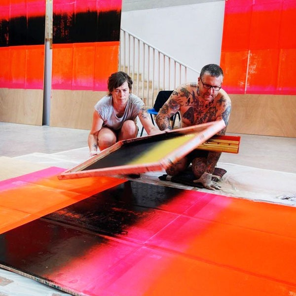 Les œuvres de Gfeller & Hellsgård oscillent entre abstraction et tension graphique, chaos contrôlé et précision artisanale. Leur palette, souvent vive, parfois acide, traduit une énergie brute, presque musicale. On y retrouve les échos du punk, du collage, du geste improvisé, mais aussi une rigueur héritée du Bauhaus, de l’art conceptuel et du minimalisme. Gfeller + Hellsgård conçoivent l’acte d’imprimer comme un geste à la fois physique et réflexif, où matière, hasard et répétition jouent un rôle aussi central que le motif lui-même. Travaillant à la croisée du design, de l’édition d’art et des arts contemporains, ils brouillent les hiérarchies entre arts appliqués et plastiques. Au fil des années, leur pratique s’est ouverte à de nouveaux supports et contextes : commande publiques, installation monumentale, bois, verre, aluminium. Ces expérimentations ne sont pas un simple jeu formel : elles visent à redéfinir la notion d’image imprimée, son existence dans l’espace, sa capacité à devenir objet, peinture, installation ou sculpture.