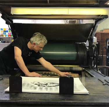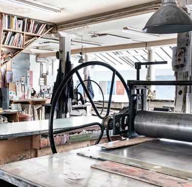Le quotidien de l’atelier est rythmé par les reflets du cuivre, le bruit des pointes qui l'incisent, le son des rouleaux encreurs et les amitiés. C'est de ce rapport privilégié, baigné d'encre et de confiance, que sont nées " Les Éditions du Lavoir ".