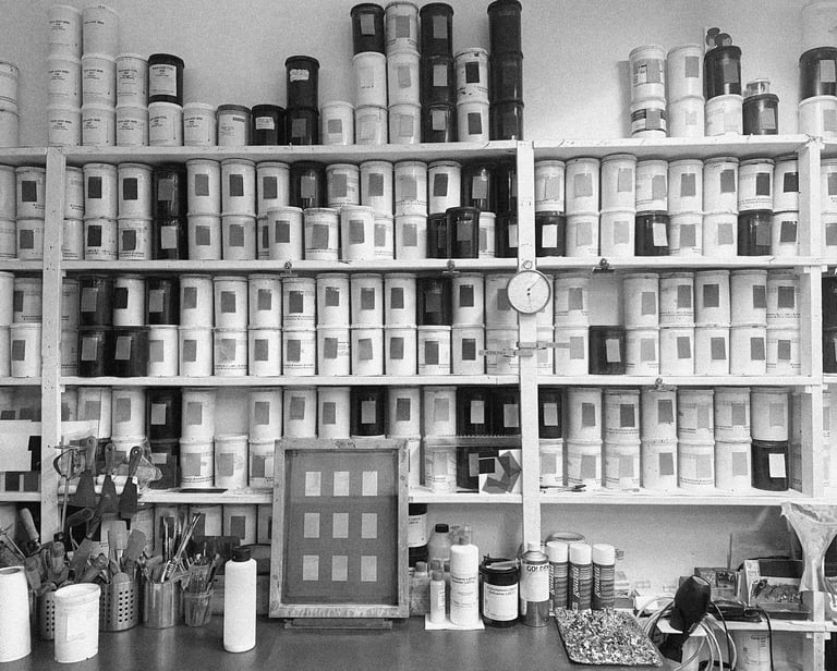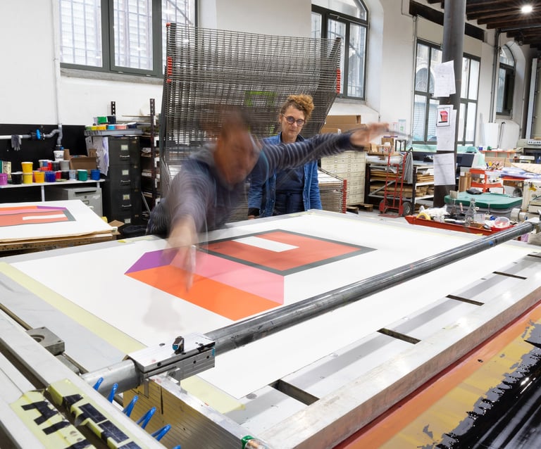 Long-standing and recurring artist collaborations with artists including Fischli/Weiss, Samuel Buri, Shirana Shahbazi, Huber/Huber, Zilla Leutenegger, Dominique Lämmli, Michael Günzburger, Dominik Stauch, Adrian Schiess, and other international artists such as John Baldessari, Wade Guyton, Wolfgang Laib and Douglas Gordon have transformed the lithography studio into a dedicated artist print studio.